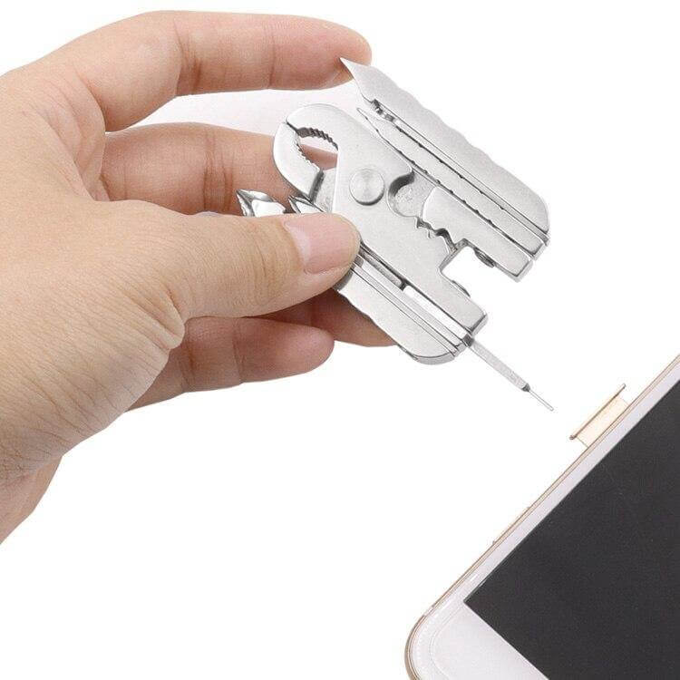 - The tool is a mini bottle opener, a screwdriver, a wrench, a hex wrench, a ruler, a butterfly wrench, a knife, a saw, pliers, a SIM card opener, a nail file, a wire cutter, a crimper, a pendant hole, and a key ring.